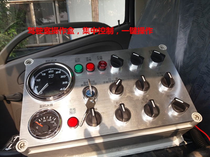 上裝標配:帶4個掃盤、萊恩31馬力副發(fā)動機、三洋馬達、施耐德控制開關、海普瑞斯電磁閥組、無級變速自動離合器、免維護離心式自動風機、不銹鋼垃圾箱、中聯(lián)北極星電子水泵,尾部LED箭頭指示燈、手動泵應急系統(tǒng)、垃圾舉升自卸功能。