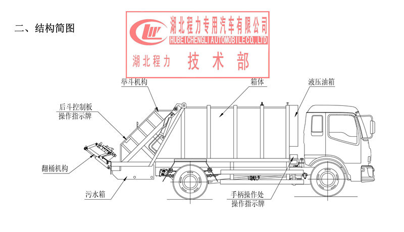 專用部分由取力器,液壓泵,氣動(dòng)手動(dòng)一體化多路換向閥, 5聯(lián)集成氣閥,油缸,垃圾廂、填裝器、刮板、污水箱、推鏟等組成。